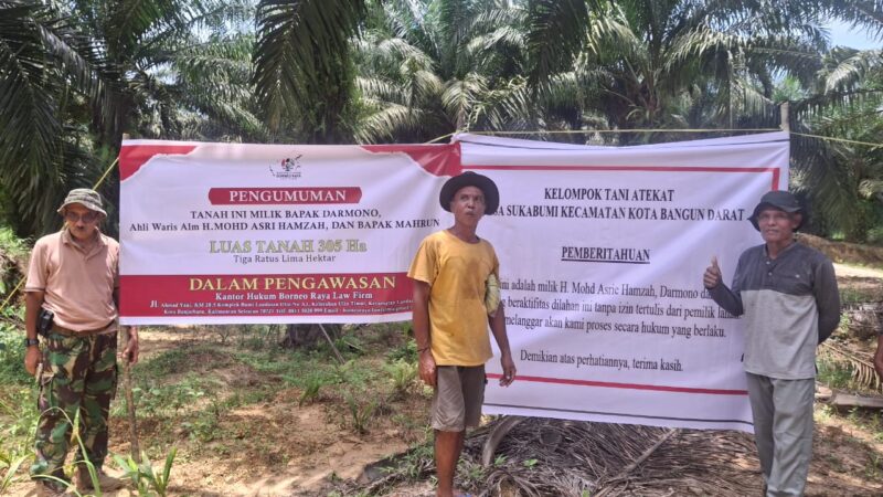SUDUTKATA.COM, KUTAI KARTANEGARA – Ketegangan pecah di kawasan SP 6, Desa Suka Bumi, Kecamatan Kota Bangun, Rabu, 1 Oktober 2025. Kuasa hukum Borneo Raya Law Firm bersama sejumlah warga pemilik lahan membentangkan spanduk penolakan terhadap PT Kutai Agro Jaya (KAJ) yang dituding menyerobot lahan seluas 305 hektare sejak 2013.